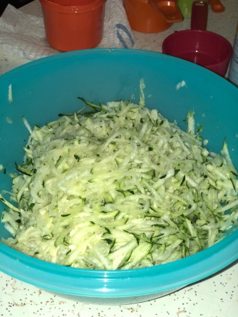 We were given a HUGE zucchini by a friend. When I say huge, I mean… well, in the pic below my daughter was already 3/4 if the way through grating it when I realized we forgot to take a picture of the actual zucchini. It was like a giant version of zucchini from a friend’s garden!