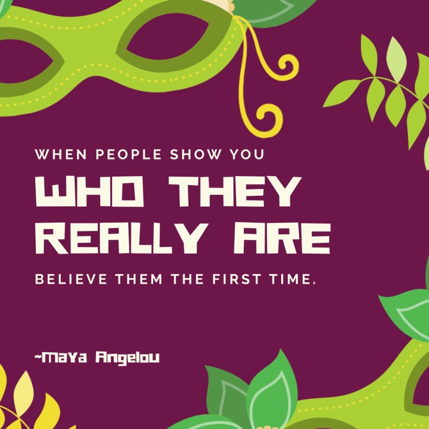 Whatever you do, whether you remain friends or walk away, it’s important that you believe them when they show you their colors. People change, that is something I fully believe, but they show a desire to grow and change. When someone shows you their colors and you see they are wearing a mask that hides who they are even from them, it’s usually a job for a professional and people with strong hearts and minds. You have to know that you won’t get sucked into their lies, hurt by their betrayals, or pulled into their world where you start putting on your own mask to protect yourself from them. To remove a mask takes therapy, time, and a lot of inner reflection and prayer. It won’t happen overnight and the process may be very ugly and painful for them and all who are around them.