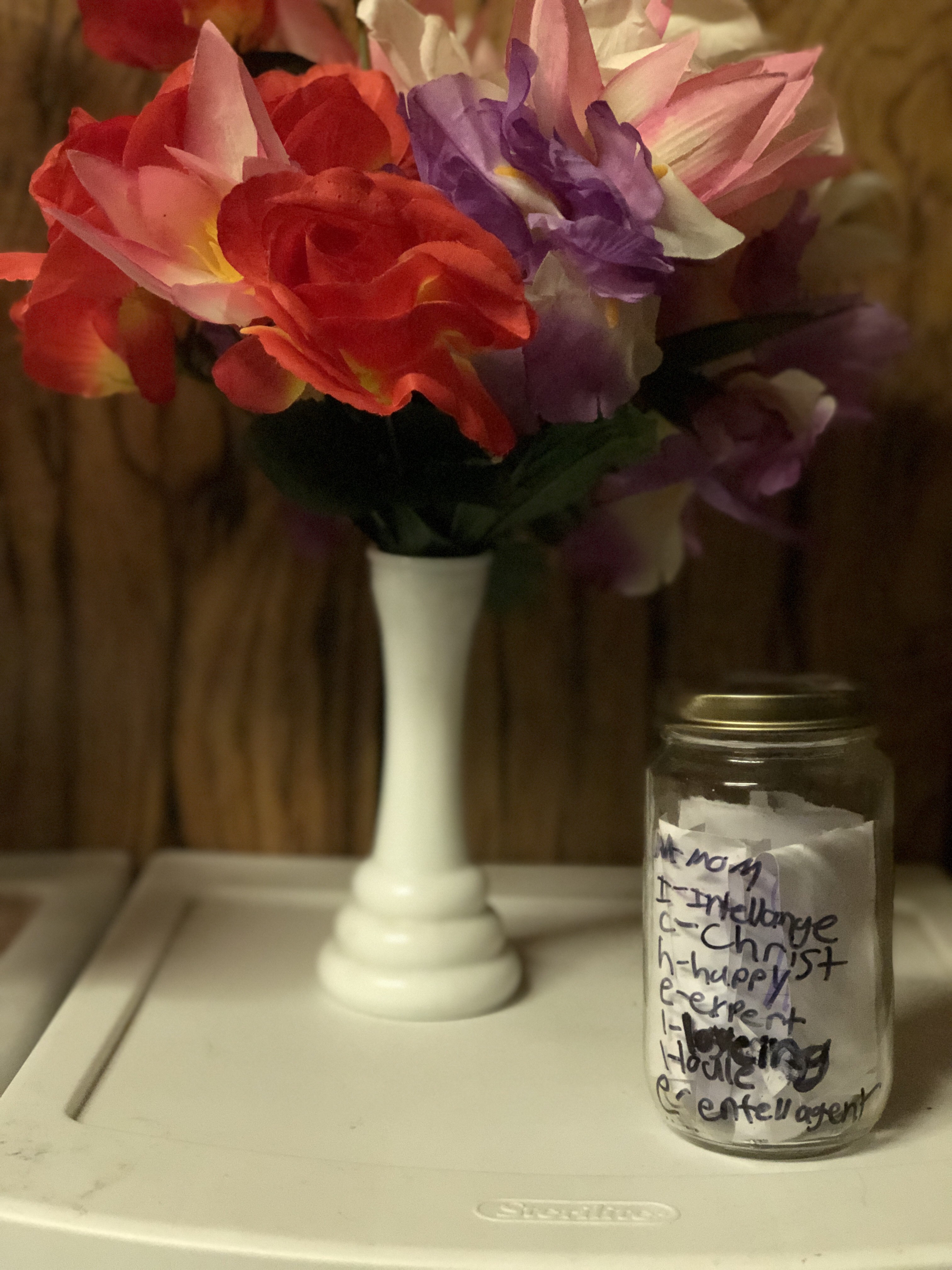 You’ll notice there is a jar above with writing on it and white papers inside. My youngest daughter created this one for me when she was 8 years old. She wrote out my name and used each letter to write a word that she thought of when she thinks of me. Inside she wrote all reasons she is thankful I am her mother. I love to look inside the jar from time to time to remember how much I mean to her.