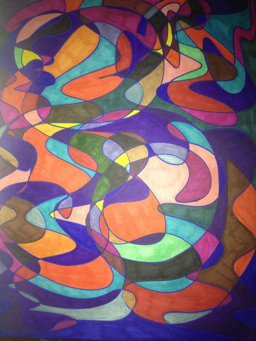 You can either draw the shapes in Sharpie and see how they come together or create an outline in pencil and then fill it in. Just let your hand run free over the canvas or paper and see what you come up with! It’s really fun when more than one person works on the same canvas or piece of paper. Here are a few examples of what we came up with.