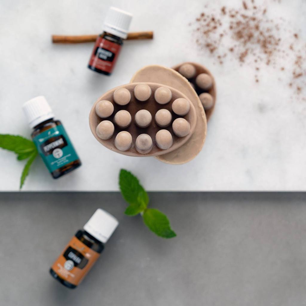 - Add essential oils: 5 drops Peppermint, 5 drops Spearmint, 3 drops Cinnamon Bark, and 3 drops Copaiba to each massage bar. Mix in with a toothpick. **Tip: Wait until the cocoa butter and beeswax mixture is slightly cooled before adding the essential oils. This keeps the temperature more consistent, which helps the oils blend well and do their job.