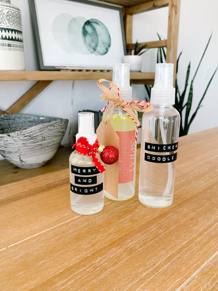 DIY Room Sprays make the perfect gift! All you need is a glass spray bottle, essential oils, water, and some witch hazel. Fill your bottle almost full of water. Add your favorite essential oils to the potency of your liking. Top with a little witch hazel, shake, and spritz. There are so many awesome combinations of oils you can use for room sprays!