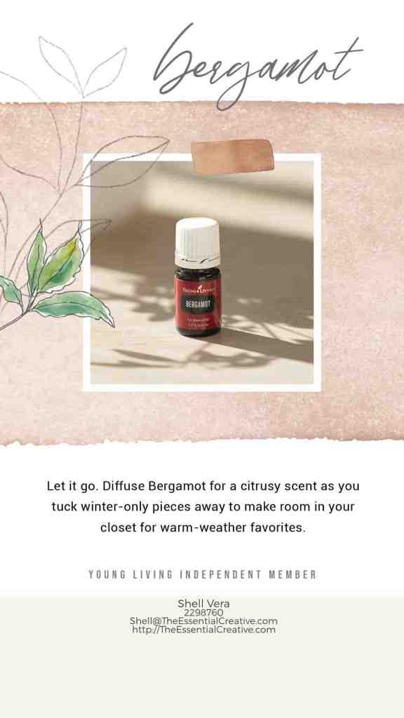 • Get your shine on. Use a drop of Bergamot on a washcloth for maximum shine as you scrub down bathroom and kitchen faucets. • Let it go. Diffuse Bergamot for a citrusy scent as you tuck winter-only pieces away to make room in your closet for warm-weather favorites.