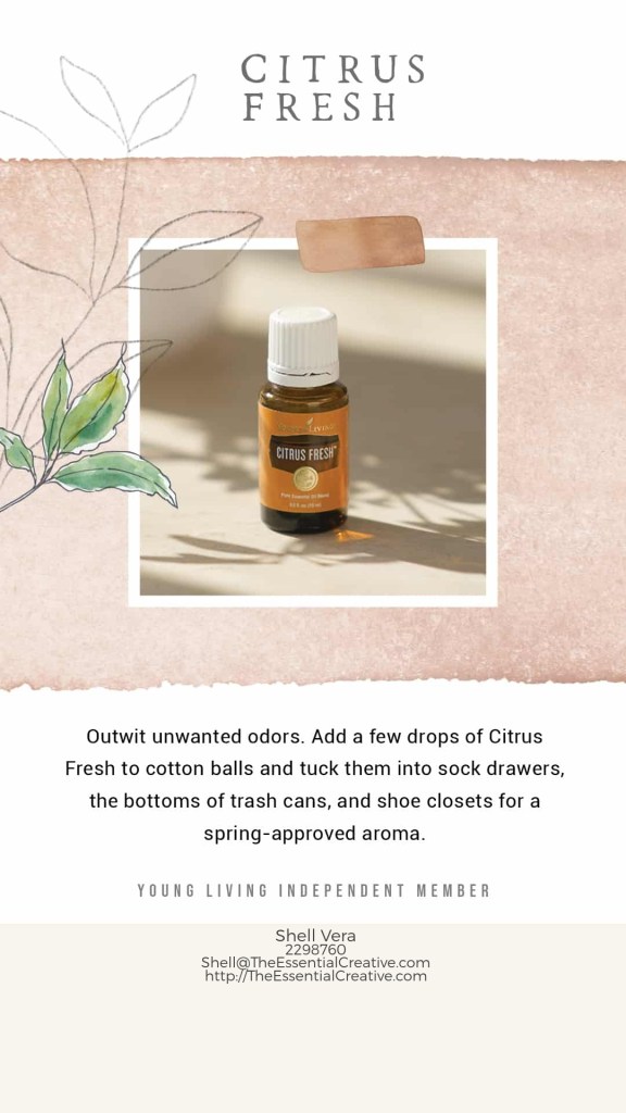 • Outwit unwanted odors. Add a few drops of Citrus Fresh to cotton balls and tuck them into sock drawers, the bottoms of trash cans, and shoe closets for a spring-approved aroma. • Defeat the dish pile. Add 4 drops of Citrus Fresh to Thieves Dish Soap for an extra burst of scent, plus the added bonus of a citrus oil that can help cut grease from dirty dishes.