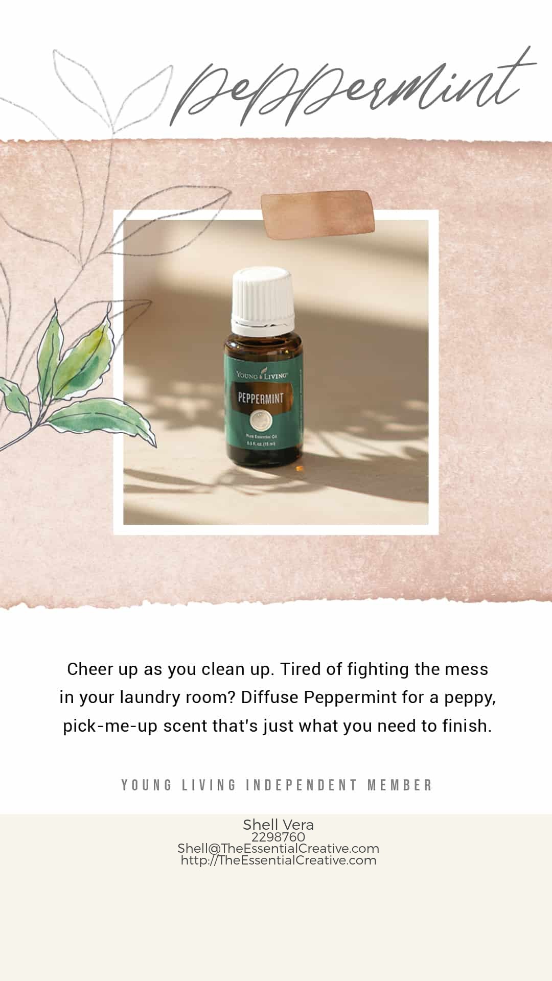 • Pep up the kitchen. Put 1 drop of Peppermint on a damp cloth and wipe down counters so your kitchen smells as welcoming as a clear blue sky after a spring storm. • Cheer up as you clean up. Tired of fighting the mess in your laundry room? Diffuse Peppermint for a peppy, pick-me-up scent that’s just what you need to finish.