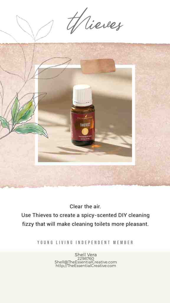 • Shine up the stove. Add a few drops of Thieves to a cupful of water and inhale the warm, spicy scent as you wipe away stovetop messes without worrying about what’s in your cleaning solution. • Clear the air. Use Thieves to create a spicy-scented DIY cleaning fizzy that will make cleaning toilets more pleasant.