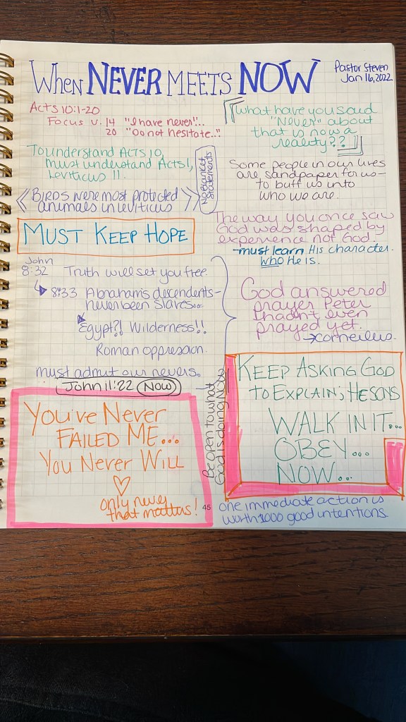 Each week, I take notes in a notebook just for sermons from Elevation. I then summarize those notes in my Silk + Sonder journal. This allows me to quickly look back throughout the week at the scriptures and notes that stood out to me, while also showing me over the course of a year how various sermons spoke to me. When I go back and listen again, I see see how I’ve changed and how I am hearing new things.